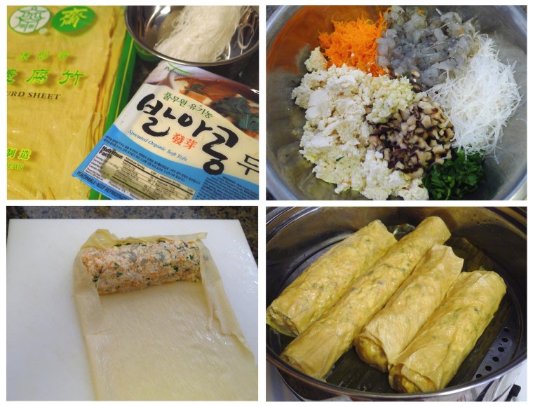 1.  Soak 4 bean curd sheets in water until soft, keep it in water until you are ready to assemble the roulade.