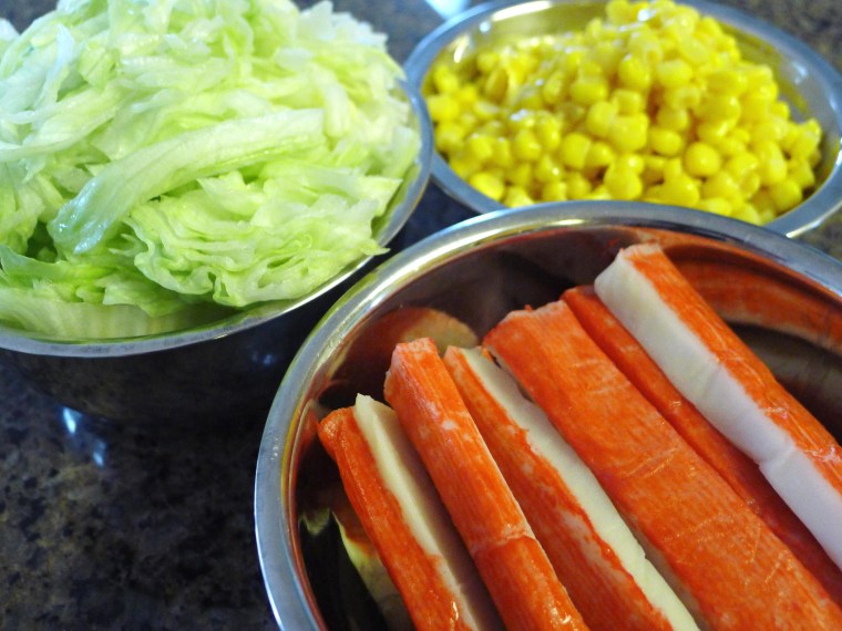 1.   Shred the 8 kani sticks ( imitation crab stick ).