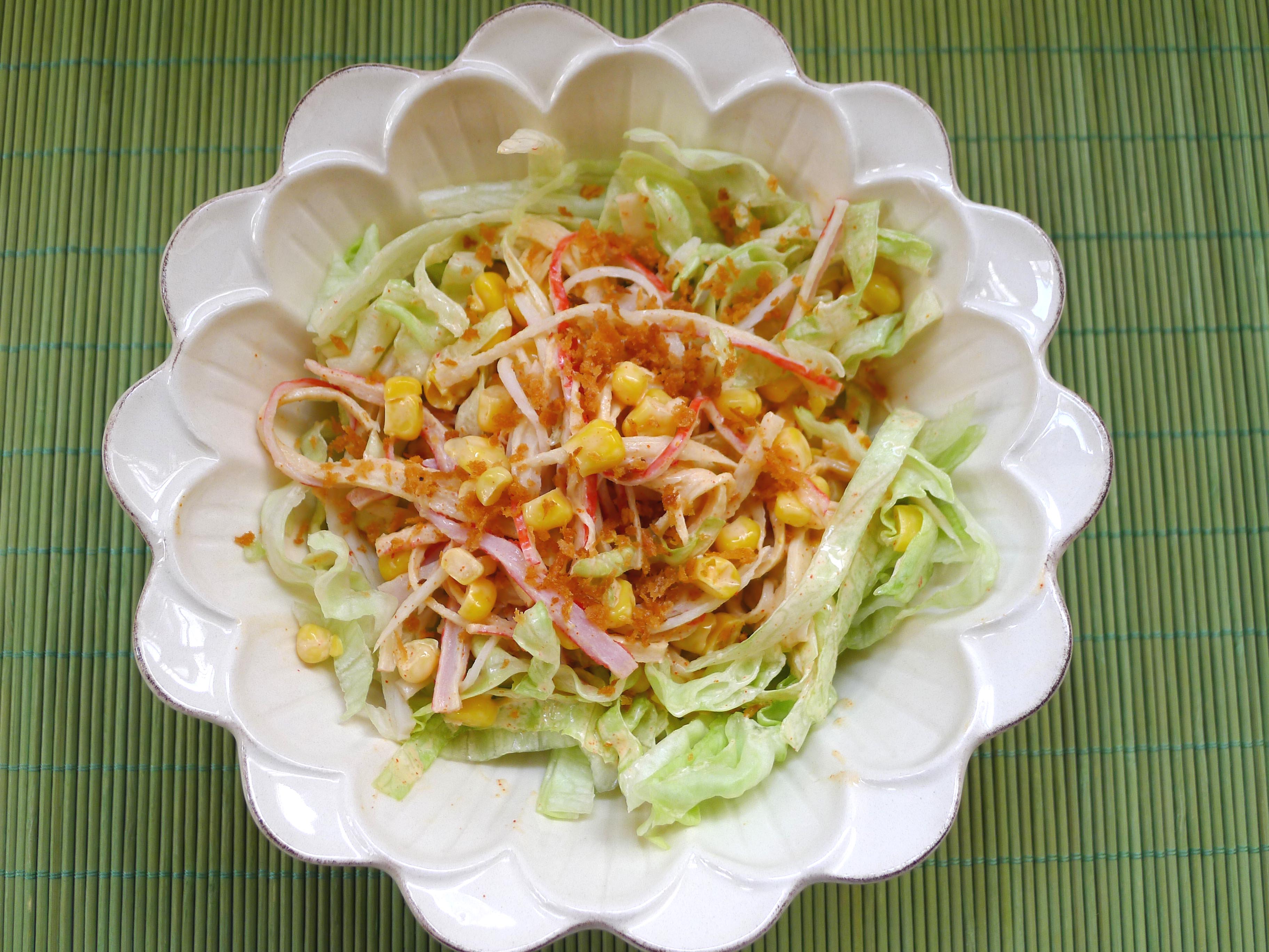 7.   Toss kani, corn kernel, and panko with the dressing then put on the top of lettuce. Serve.