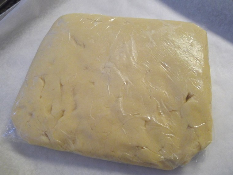 1. Cream together 3/4 pound (3sticks) unsalted butter (at room temperature) and 1 C sugar until just combined then add 1 tsp vanilla extract. On low speed mixed slowly add flour mixture (3 1/2 C all purpose flour + 1/4 tsp salt). Form the dough into a flat rectangle about 7″x 6″, wrap in plastic, chill for 30 minutes.