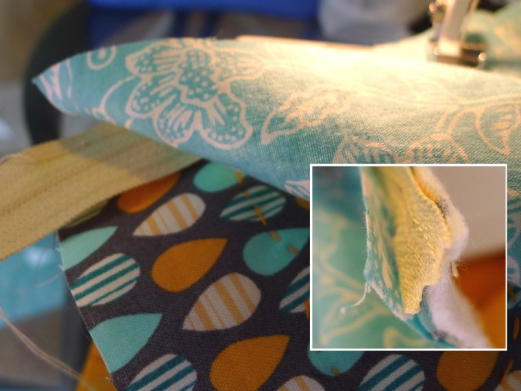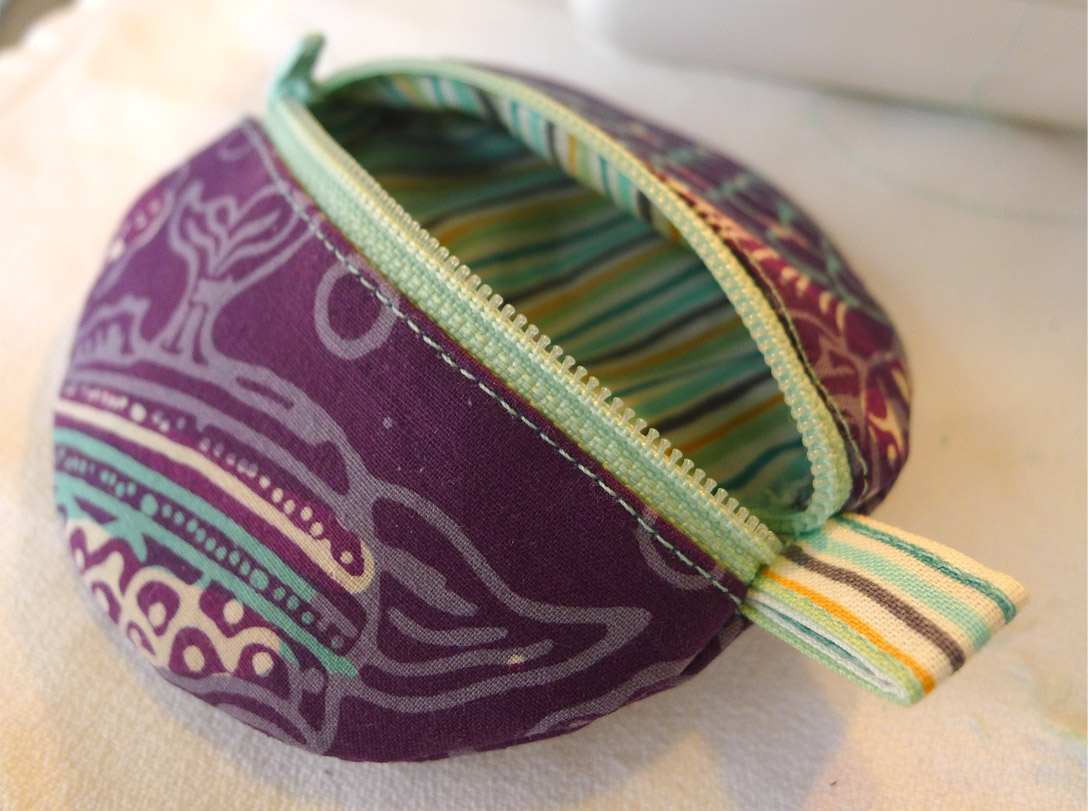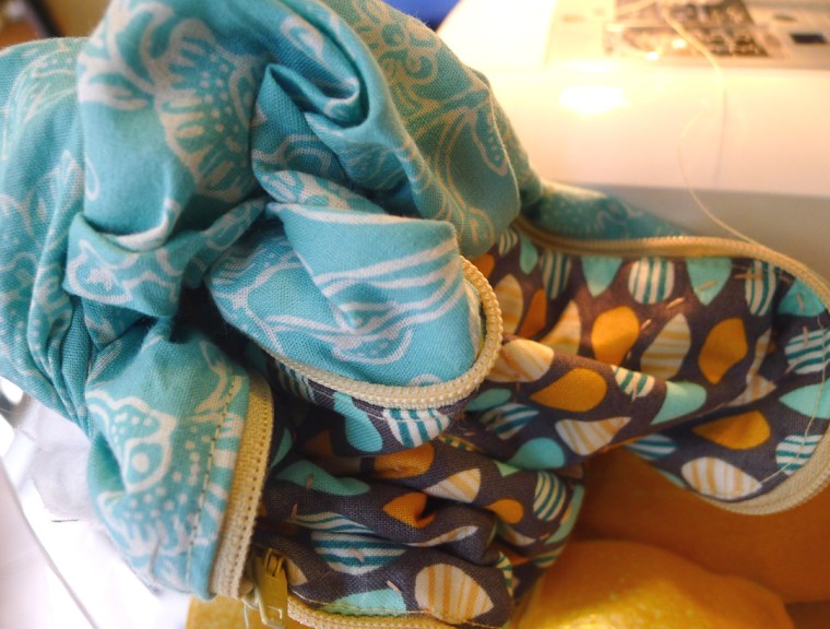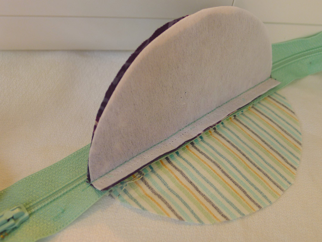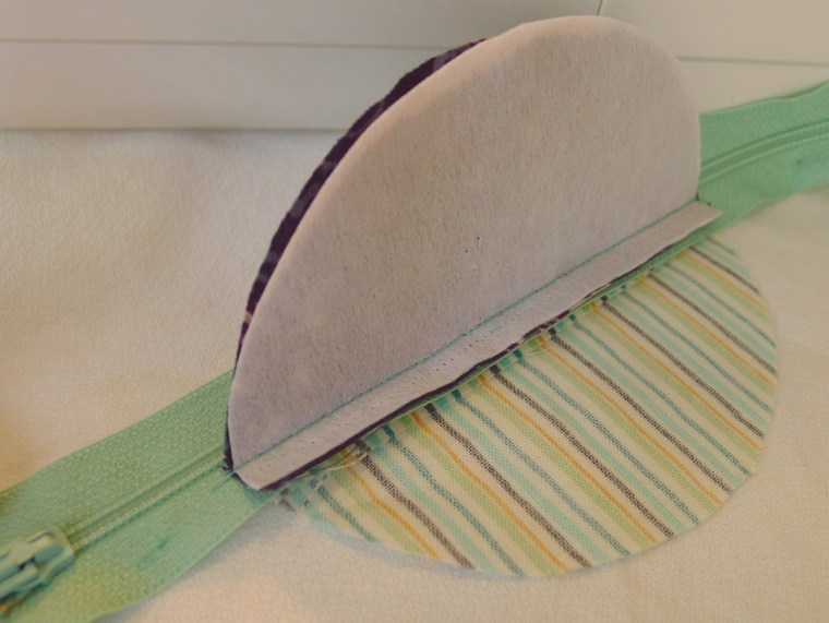 11. Sew about 0.25″ from the edge, trim the excess interlining just before the stiches, cut the excess zipper, then flip inside out.