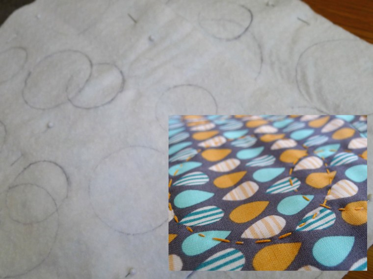 2. Place main fabric and cotton batting together, draw any pattern you like ( here are random big and small circles ), then hand stitch using contrast thread. Since I don’t have erasable pencil, I drew on the batting side to keep the main fabric clean. This is optional but I like to put this extra step to add nice detail and to stabilize the cotton batting onto the main fabric.
