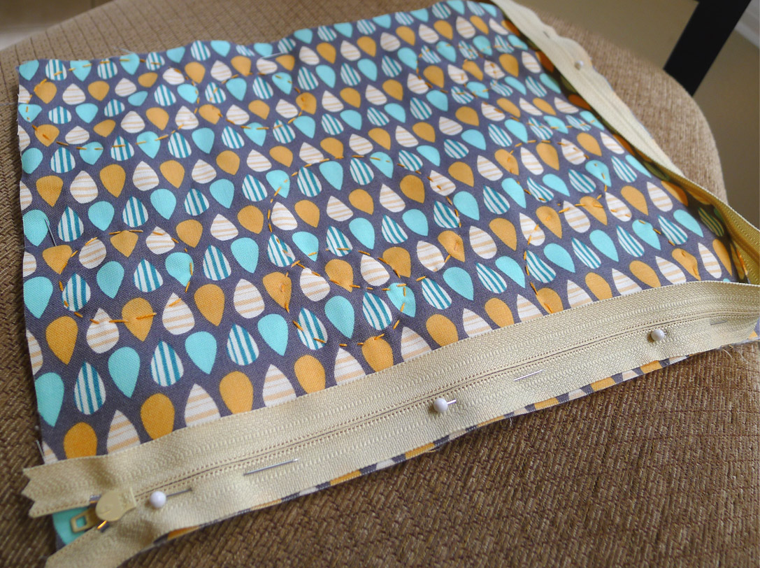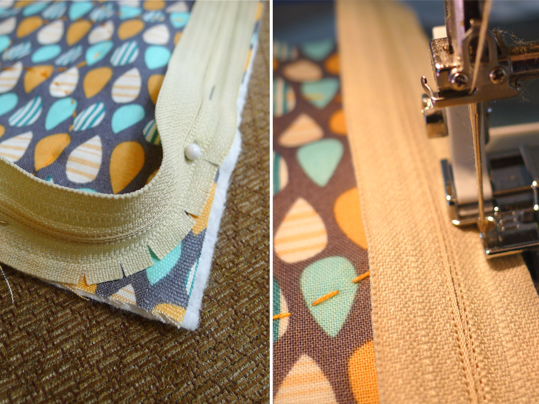 3. Pin the zipper on the main fabric, right size facing together as pictured.