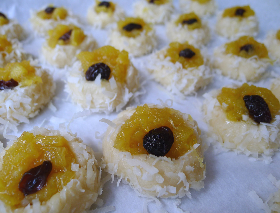 This one is super easy and fun looking cookies. Not only cute because of the texture of coconut flakes but I really like how it tastes. The original recipe uses raspberry and/or apricot jam, I modified mine using my homemade chunky pineapple jam and adding raisin on the top. The Pineapple jam gave me idea for the name because it has sourness, just enough, to give fresh and unique taste. With the sweetness from sweetened coconut flakes I think Sweetsour Cookies is the prefect name.