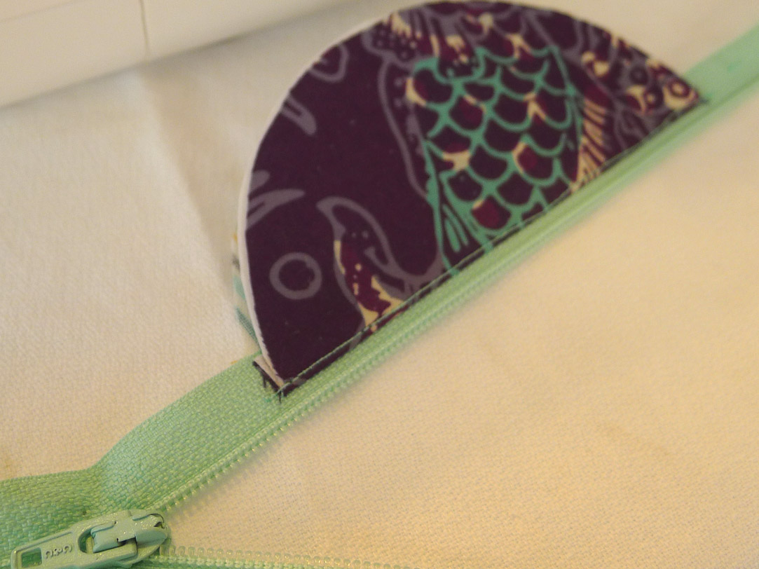 4. Sew 1/4″ from the edge. You can also sew the lining at the same time but here I separate the steps. Make sure to cut the zipper edge at the curve area as pictured.