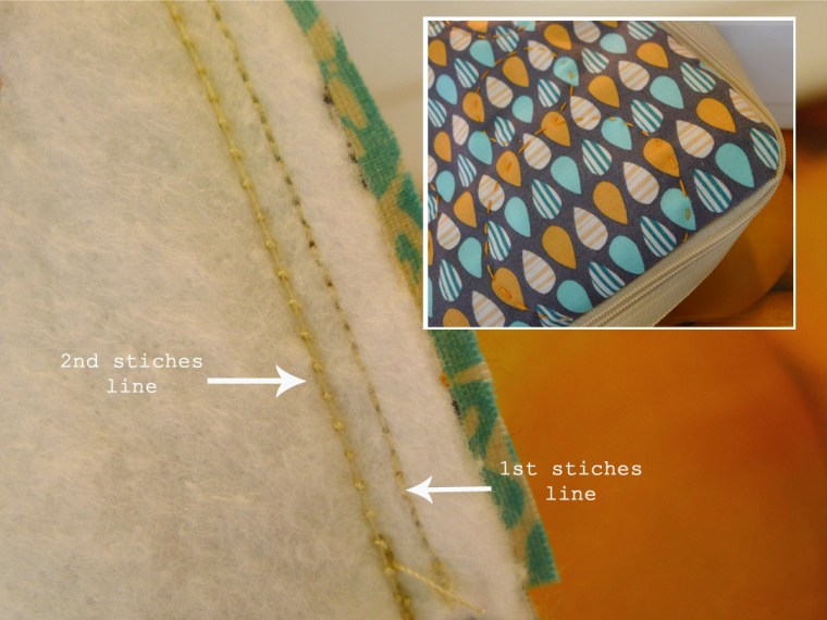 7. Sew 3/8″ from the edge, closer to zipper opening. This later stitch line will hide the 1st stitch line on the main fabric, the reason why I sew 1/4″ on the step#4… hopefully this is not confusing you 🙂