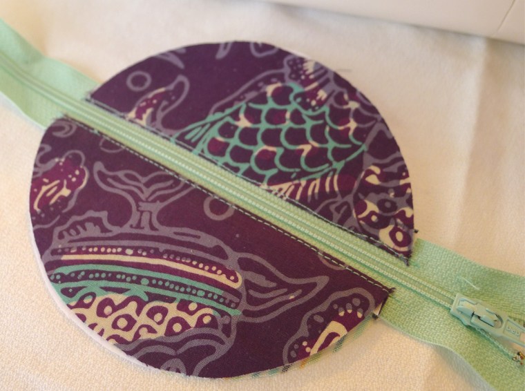 3.  Line and pin the 1st half circle main fabric, lining, and interlining with zipper positioned in between main fabric and lining. Right side of main fabric and lining facing each other.