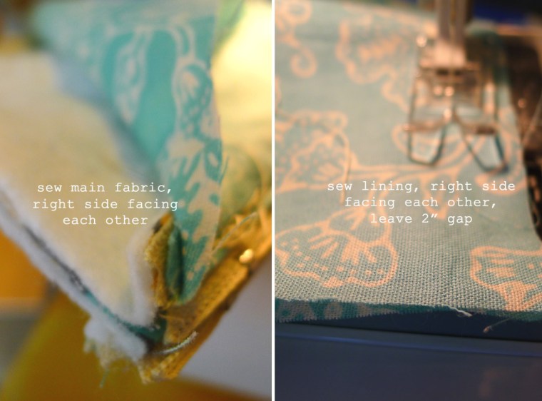 9. Open the zipper, pin the main fabrics with right sides facing each other, make sure the linings are not included, Sew 1/4″ from the edge. Cut extra length of zipper. Next, pin the linings together right sides facing each other, don’t forget to leave at least 2-3″ opening for flipping the fabrics inside out.