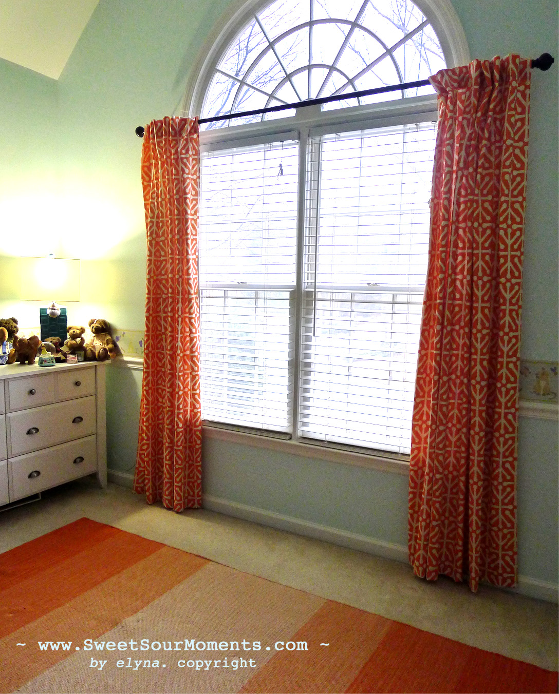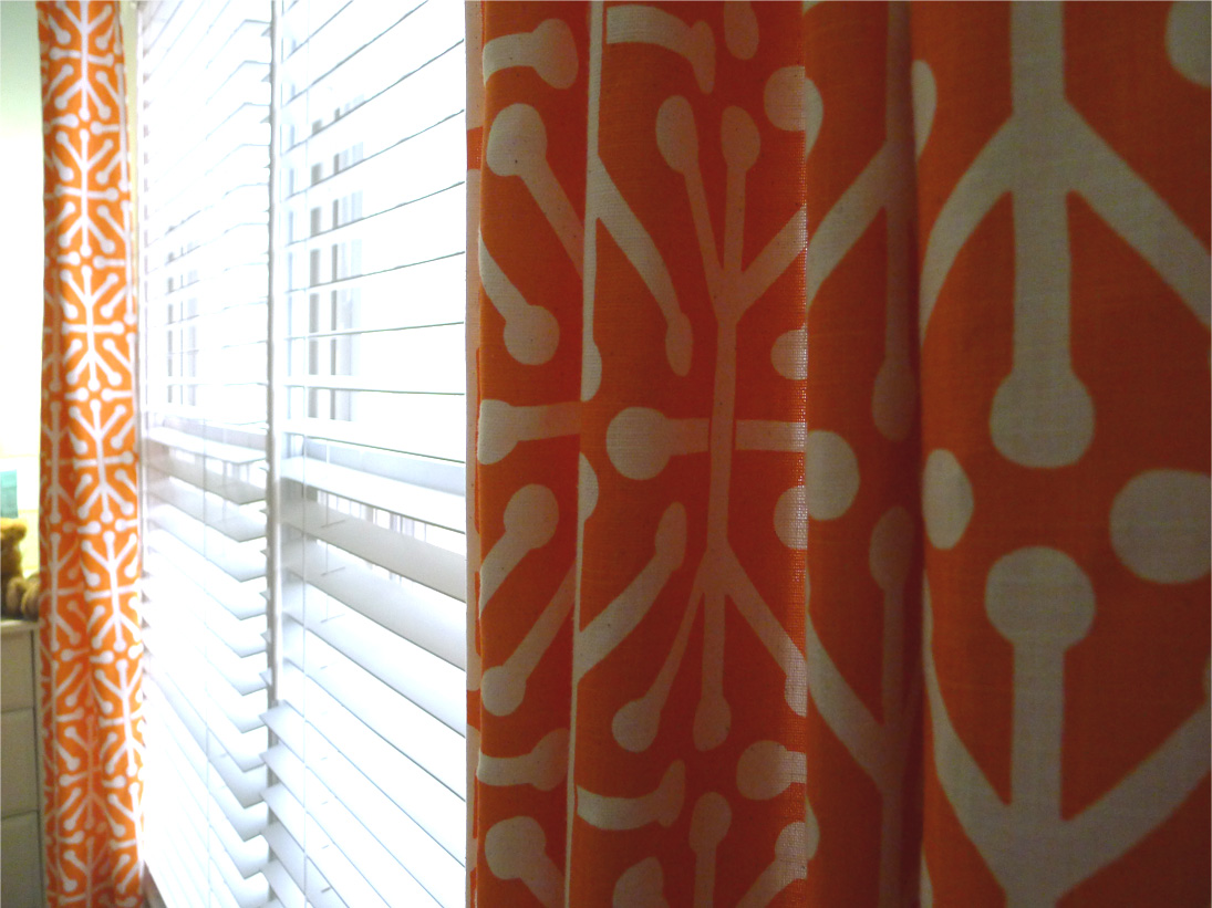 Got the fabric for the curtain on sale at $6.69/yard at fabric.com … I had been looking for fabric in orange color, with fun pattern, thick material, and good price. When it arrived I was so happy, it was all that I looked for.. the print quality is nice and the cotton duck fabric looks expensive. If you are looking for customized window covering, instead of DIY project, maybe this website can help PaylessDecor.