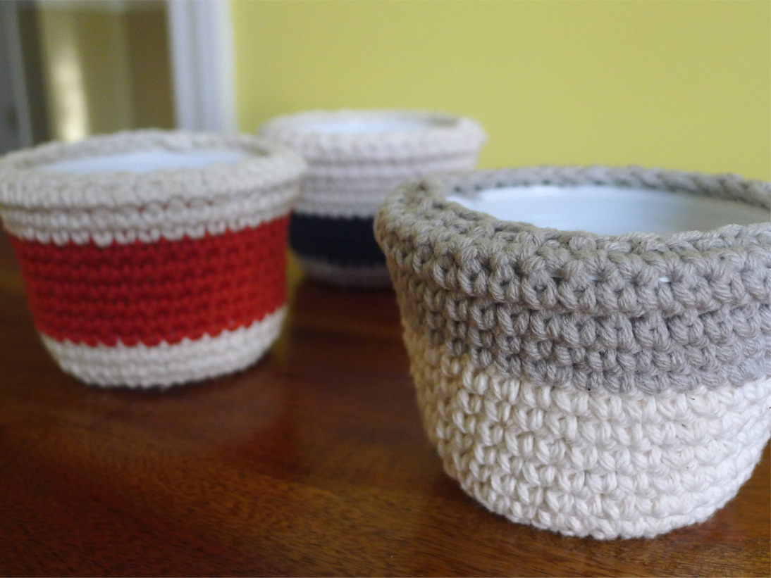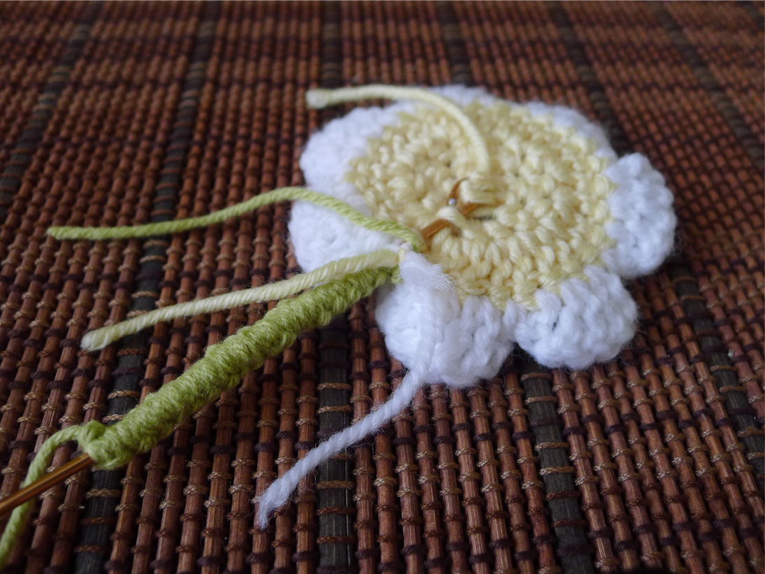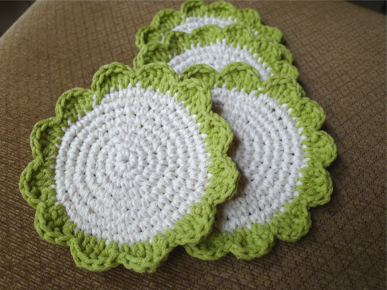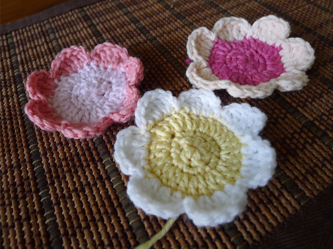 I made these coasters for housewarming gift, I don’t have the crochet pattern for this project though .. sorry. What I did was making 4 chains, sl st together to make a circle then sc along the chains. In the inner round I did 2 sc at the same space, when the circle got bigger I reduced the count. I added sc at the same space whenever the edge began to curl, otherwise 1 sc for each space. The good news is I have the pattern for the flower edge 🙂 It needs 4 chains space for each : 1 sc, 1dc 1tc at the same space, 1tc, 1dc 1tc at the same space , repeat.