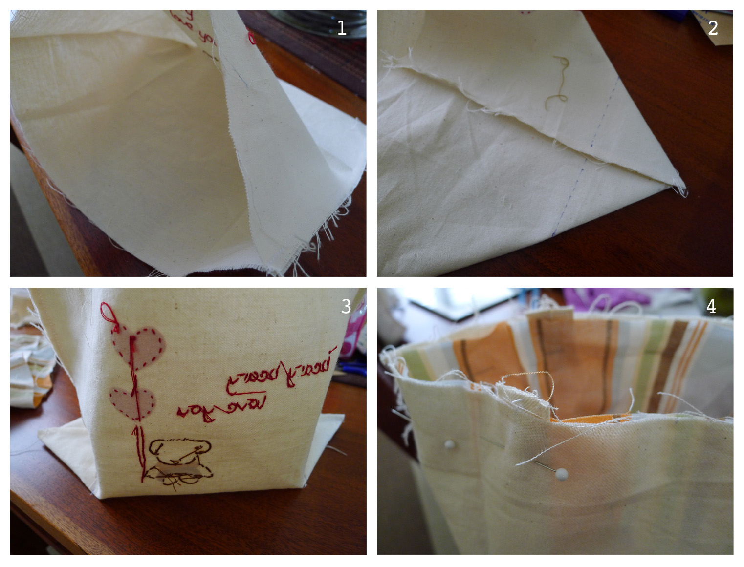 Fold in half and sew the fabric on the longest side with right side facing together. Do the same for the lining. Draw line about 2″ from each corner, sew, then cut the excess. Do the same for the lining.