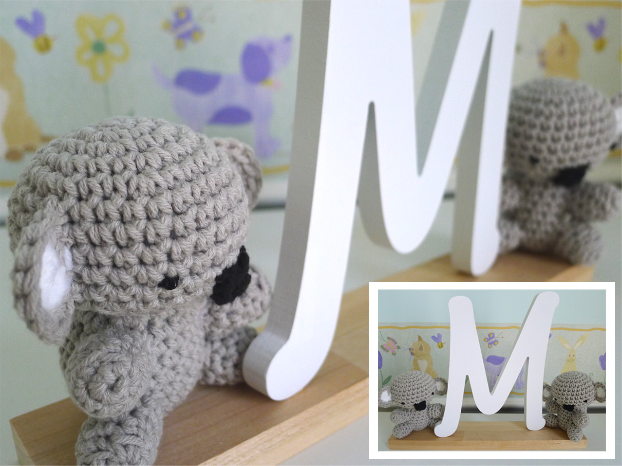 When I found the crochet pattern (link : Koala pattern) for this cute Koala, I couldn’t resist to try it right away … such a cute amigurumi. I madeΒ a pair of it then put them with M wood initial for my baby nursery. Hopefully my little M will like it as much as I do …happy with how it turns out.